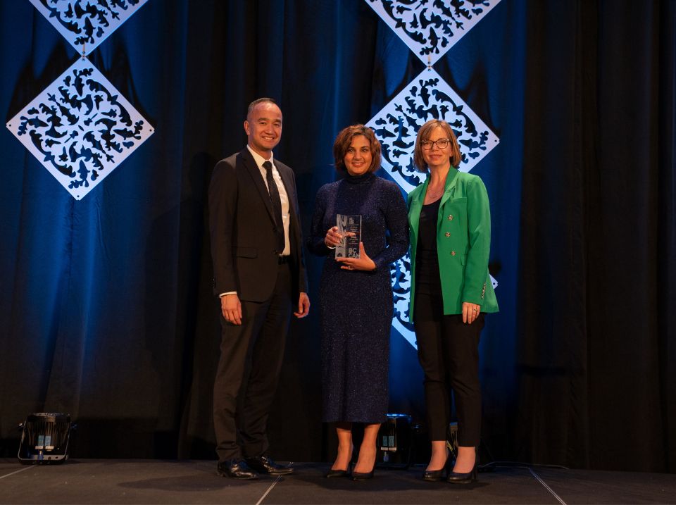 Ruby Gidda receiving her Excellence Award from BC Cancer's Dr. Kim Chi, executive vice president and chief medical officer, and Tracy Irwin, chief operating officer at the 2023 BC Cancer Summit awards dinner on Nov. 17, 2023.
