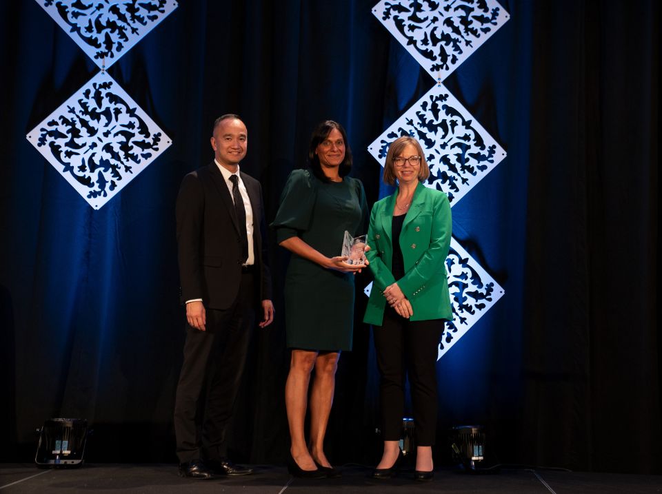 Satnam Sidhu receiving her Excellence Award from BC Cancer's Dr. Kim Chi, executive vice president and chief medical officer, and Tracy Irwin, chief operating officer at the 2023 BC Cancer Summit awards dinner on Nov. 17, 2023.