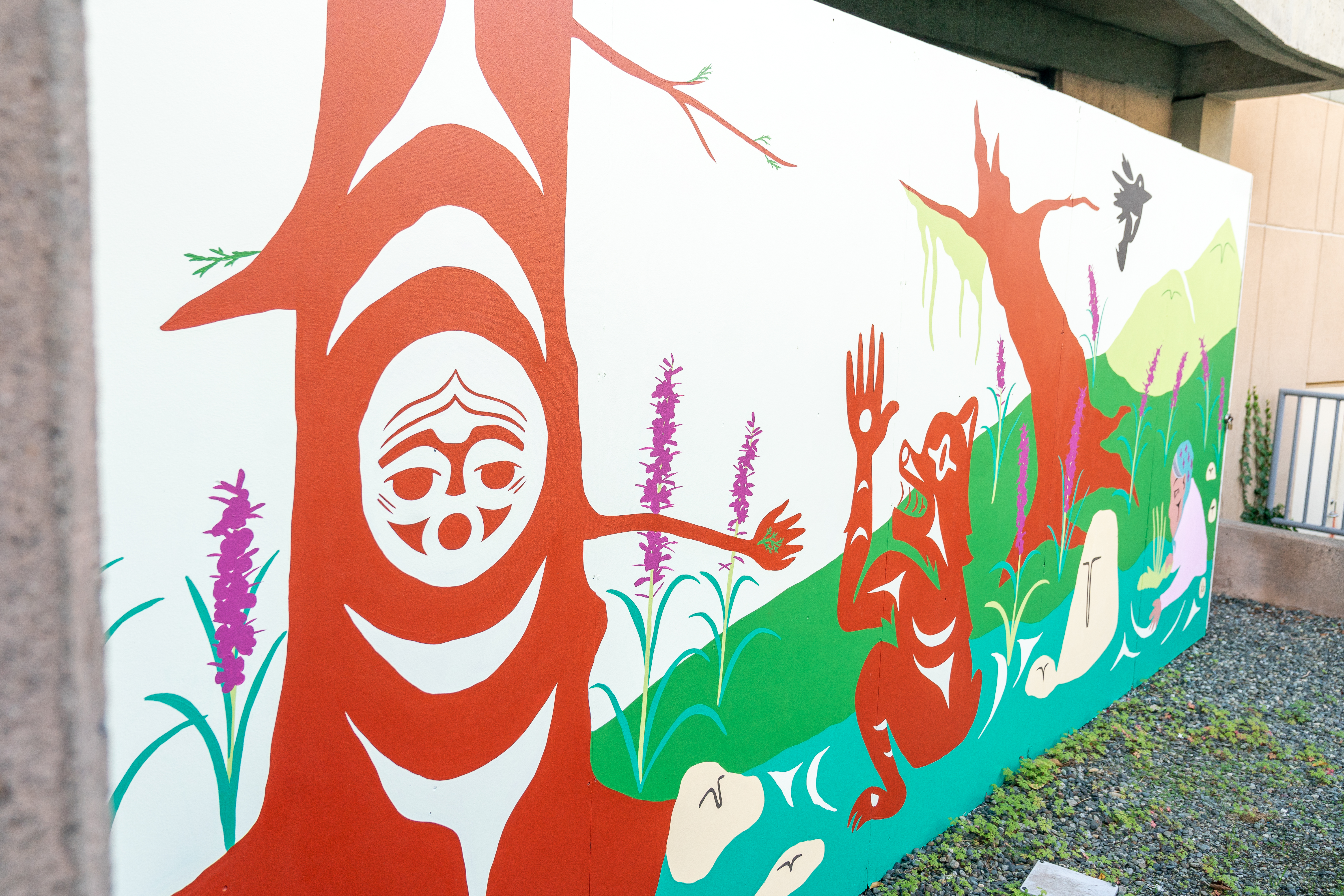 This is why there is specific imagery in the mural installation that speaks to White-Hill's lived experience with relatives who have had cancer. For example, a longer piece of art featuring a bear praying to a cedar tree references a print he created for his aunt when she was first diagnosed with cancer.