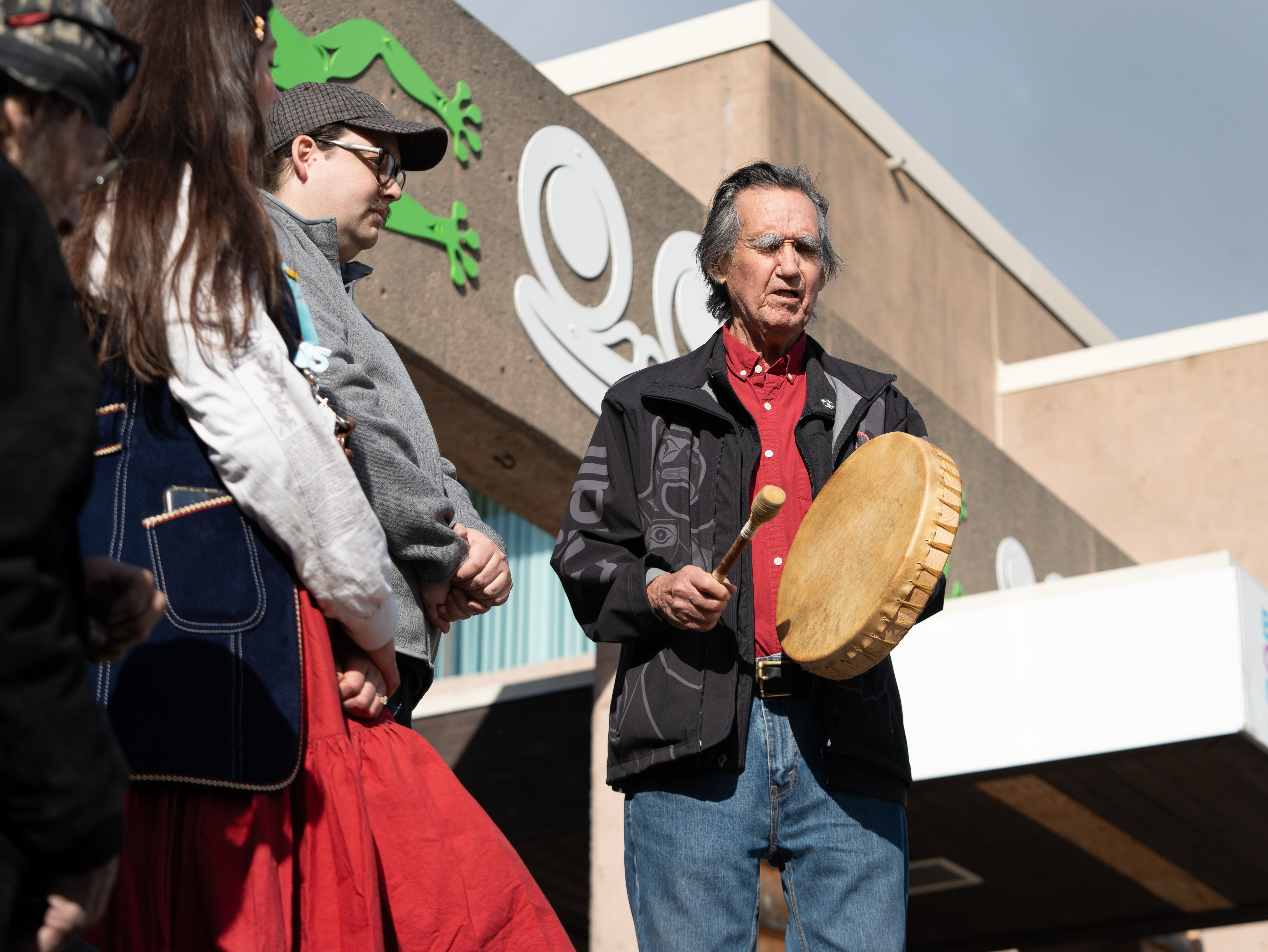 Drummer Black Jack, an elder from the Lheidli T'enneh First Nation, at the Oct. 29, 2025, blessing-unveiling of Eliot White-Hill's mural installation at BC Cancer - Surrey.