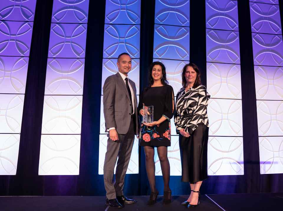 Dr. Arefeh Rouhi, doctor and scientist, research at the Terry Fox Laboratories, BC Cancer Research Institute receiving her Excellence Award from Dr. Kim Chi and Heather Findlay at the 2022 BC Cancer Summit.