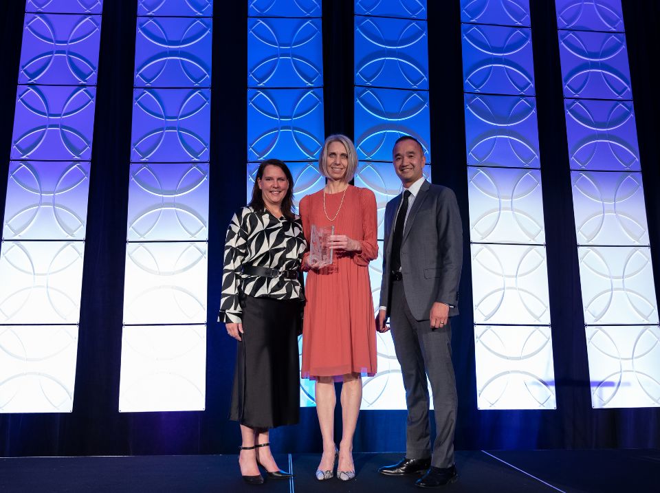 Jennifer Suess, pharmacy professional practice leader at BC Cancer - Abbotsford, receiving an Excellence Award on behalf of the Abbotsford Pharmacy team from Dr. Kim Chi and Heather Findlay at the 2022 BC Cancer Summit.