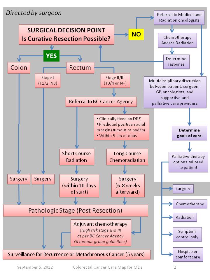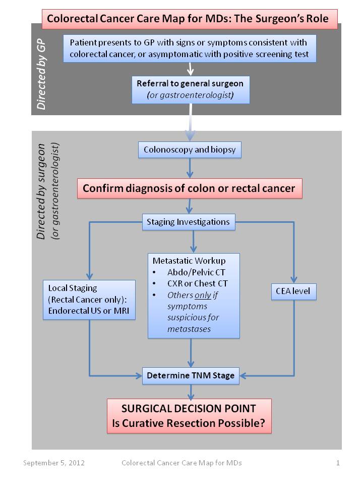 Please see the Colorectal Cancer Care Map for Physicians (below) developed by the BC Cancer Surgical Oncology Network and the accompanying text which is included in 8 Appendix.
