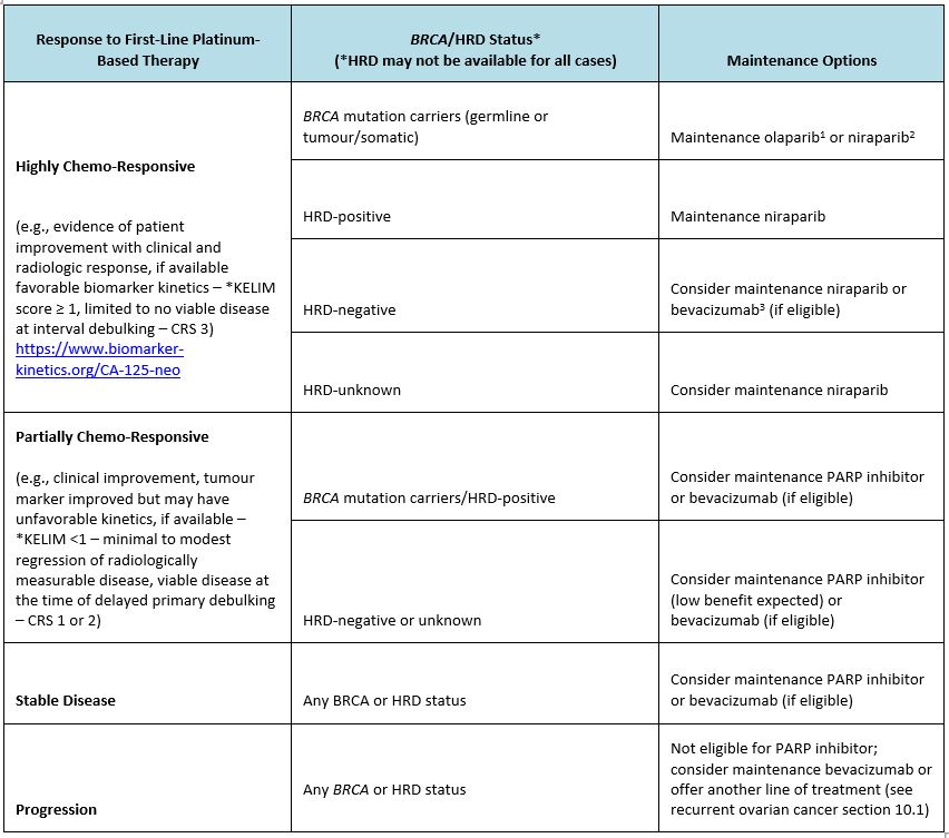 Table 4: First-line Advanced EOC - Maintenance Therapy Approach in Patients Treated with Post-Operative Chemotherapy Note: The final treatment decision should be made in consultation with an oncologist, considering individual patient factors and eligibility criteria.